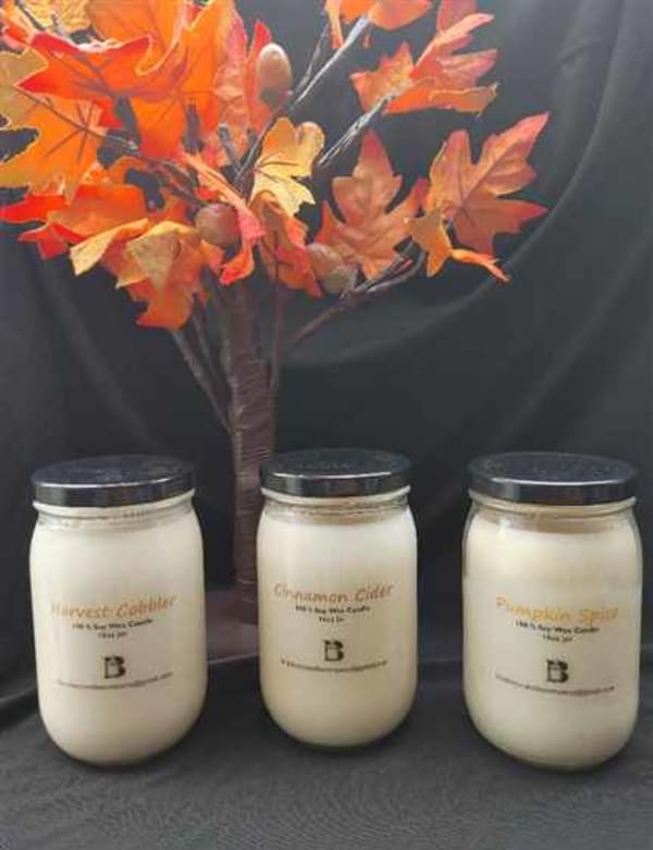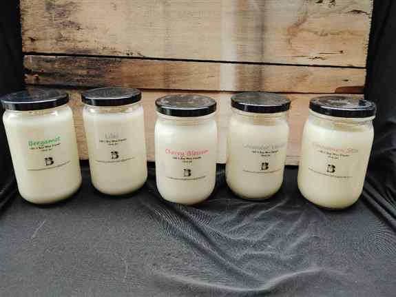 We create small batch, hand poured, 100% soy wax candles. Using essential oils for our scents we keep each candle all natural. With 14 different fragrances available, you are sure to find something to entice each corner of your home. Our candles have excellent scent throw lasting up to 80 hours of burn time. Our candles come in a simple 16oz jar, As we say it, Simple jar, Simple price, Great fragrances!Product Images: