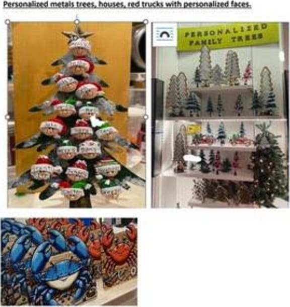 Moonlight Treasures/Crafts is located in the Town Mall of Westminster, MD occupying 4500 sf store. We have various handmade holiday decor & crafts, collectibles, sports memorabilia, gifts and so much more... We can personal anything you buy. Our best seller are the Metal Christmas Trees, Red Trucks, Victorian House, Campers, Fireplace and Crabs personalized with magnet faces.Other items include: