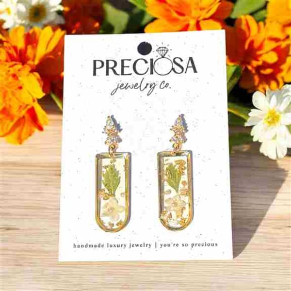 Preciosa Jewelry Co. is a botanical-inspired jewelry brand specializing in real preserved wildflowers and hand-sculpted clay creations. Each piece is thoughtfully handcrafted using blooms from our own garden and trusted local floral farms, then preserved in resin to create timeless, wearable keepsakes. Our hand-painted clay jewelry brings whimsical charm and artistry to every design, celebrating the beauty of nature in every season. With a focus on quality, craftsmanship, and heartfelt meaning, Preciosa Jewelry Co. offers feminine, heirloom-worthy pieces made to honor life’s most precious moments.Product Images: